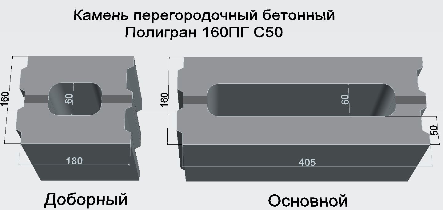Обновленная версия камня Полигран 160ПГ, основные отличия: двойной паз-гребень, толстые наружные стенки 50 мм плотного бетона - возможность надежного закрепления полок, кухонь. Сквозная пустота дает возможность протягивать кабельные гофры вертикально.